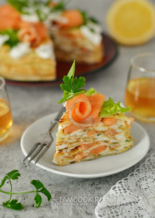 3. Сборка торта: Начинайте с блина, распределите по нему сыр и добавьте немного семги. Следующий блин кладите уже только с сыром. Чередуйте слои, прижимая их аккуратно ладошкой для лучшей сцепки.
