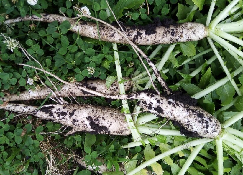Уборку дайкона проводят в сухую погоду, чтобы корнеплоды быстрее высохли. Делать это нужно аккуратно, чтобы не травмировать хрупкие плоды, особенно продолговатые. Хранить дайкон можно в погребе при температуре 0–1 °C, присыпав корнеплоды сырым песком.