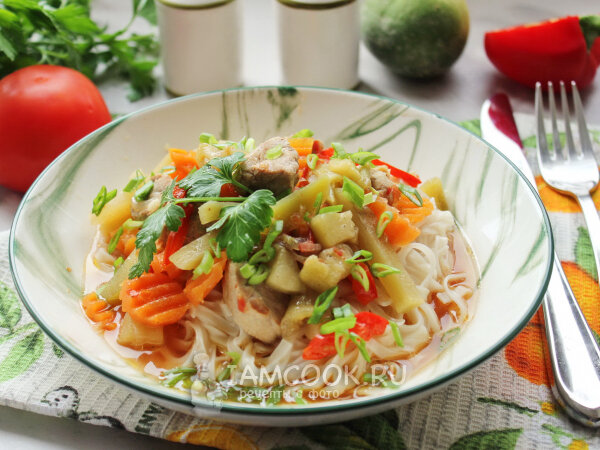 При подаче положить сначала лапшу, сверху выложить овощи с мясом и бульоном. Приятного аппетита!