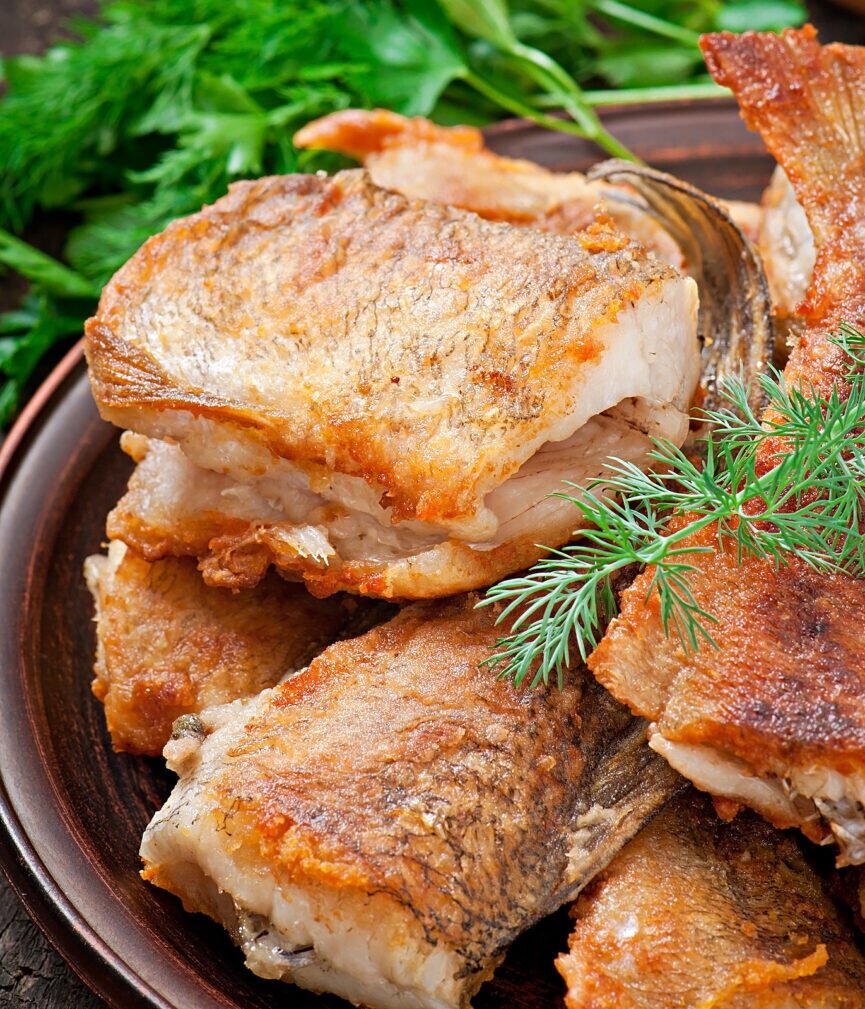4. Выкладываем хек на сковороду и жарим около 15-25 минут на высокой температуре, регулярно переворачивая, чтобы избежать подгорания.