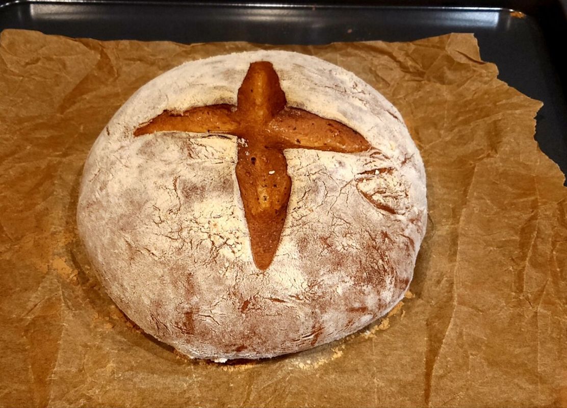 6. Перед помещением в духовку делаем надрезы на поверхности хлеба и ставим его выпекаться на 45-50 минут. Для проверки готовности используем зубочистку — тесто должно быть пропечённым.
