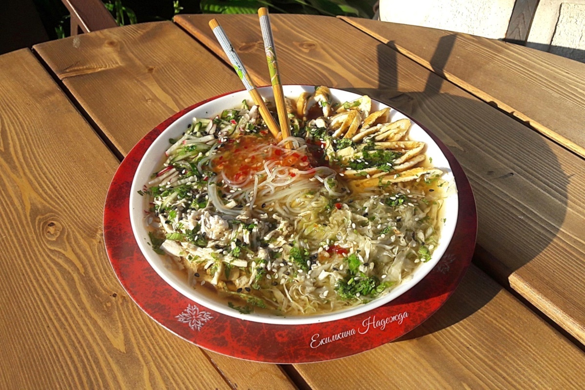 При подаче супа в тарелку укладывают слои: курицу, свежие нарезанные овощи, обжаренную капусту и фунчозу. Завершает блюдо добавление соусов и свежемолотой зелени, заливая все холодным бульоном.