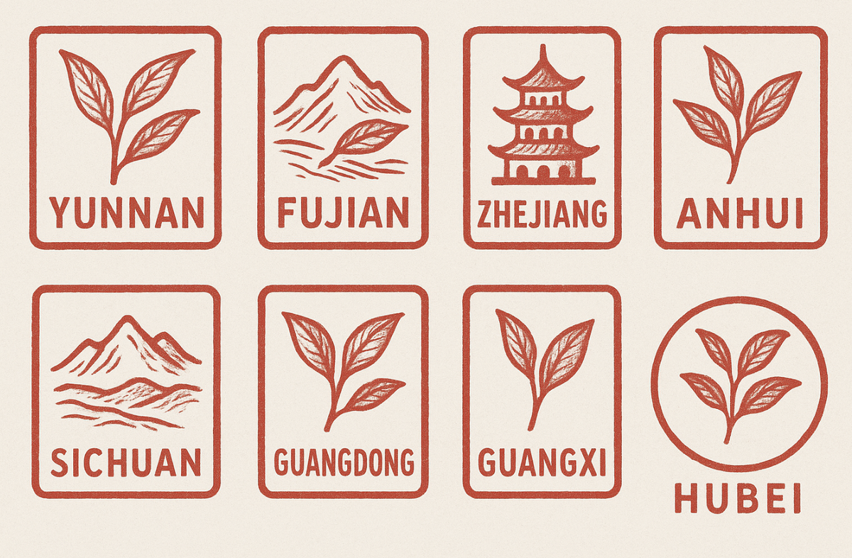 Юньнань: Этот юго-западный уголок страны считается родиной чайной культуры. Высокогорные местности с уникальными микроклиматическими условиями являются домом для древних чайных деревьев, из которых производят знаменитый пуэр. Здесь произрастают дикие экземпляры (гу шу), возраст которых может превышать сотни лет. Эти великанские деревья, располагающиеся на высоте 1500-2000 метров, имеют мощную корневую систему, наделяющую чай глубоким вкусовым профилем и энергетикой.