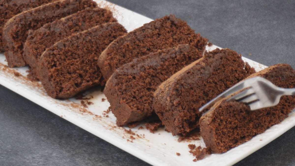 Пока пирог выпекается, подготовьте пропитку: смешайте молоко и сгущенное молоко в миске. После завершения готовки переверните пирог на тарелку и сразу же полейте пропиткой, дав ему настояться около 10 минут. В конце посыпьте какао-порошком перед нарезкой.