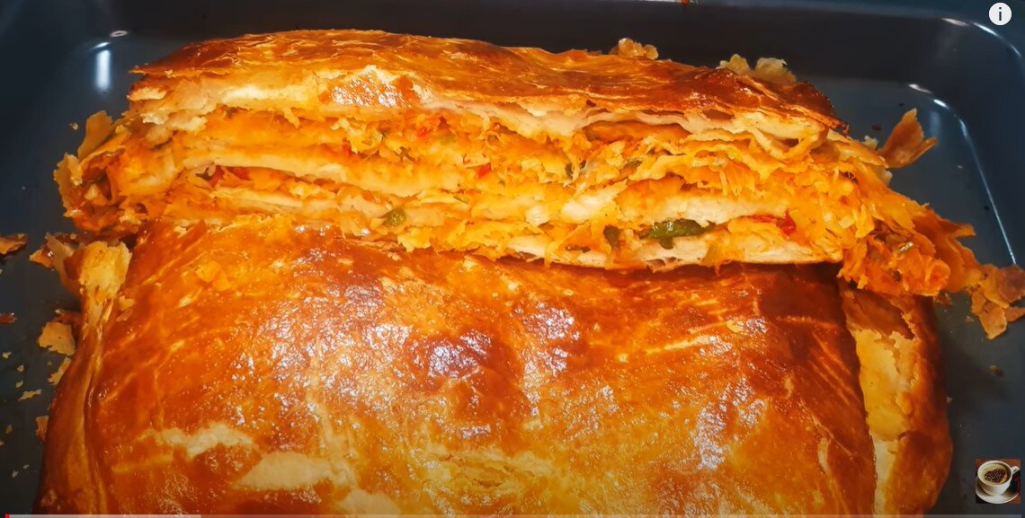 Отправьте пирог в разогретую до 180 градусов духовку примерно на 30 минут. Как только верх станет золотистым, можно смело подавать к столу. Этот пирог поднимет настроение и станет звездой любого обеда!