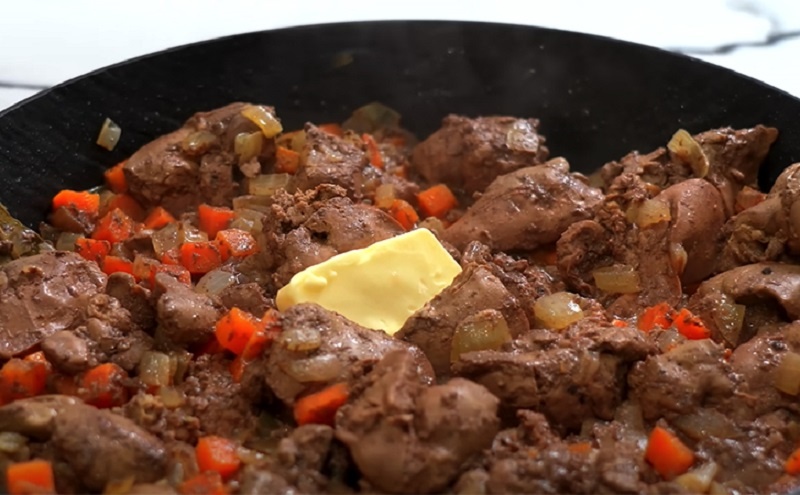 Нарежьте куриную печень крупными кусками и добавьте её к овощам. Посолите, поперчите и добавьте лавровый лист. Тушите под крышкой 8-10 минут на медленном огне, пока печень не перестанет быть розовой внутри. Напоследок добавьте немного сливочного масла и дайте настояться несколько минут под крышкой для достижения бархатистой текстуры.