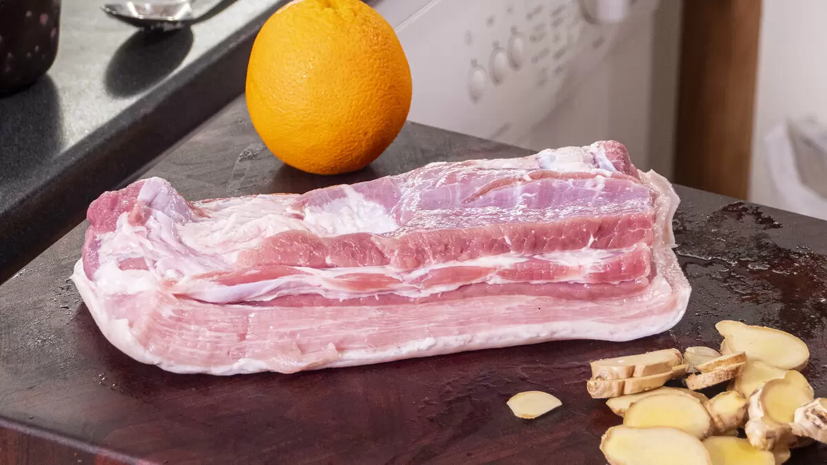Теперь в форме для запекания делаем место и помещаем обжаренную грудинку шкурой вверх. На мясо аккуратно укладываются оставшиеся апельсиновые дольки и имбирь. Это позволит сохранить сочность блюда. Поливаем всё соевым соусом и отправляем в предварительно разогретую до 170 градусов духовку на 1 час, после чего поливаем соком и запекаем ещё на 1 час.