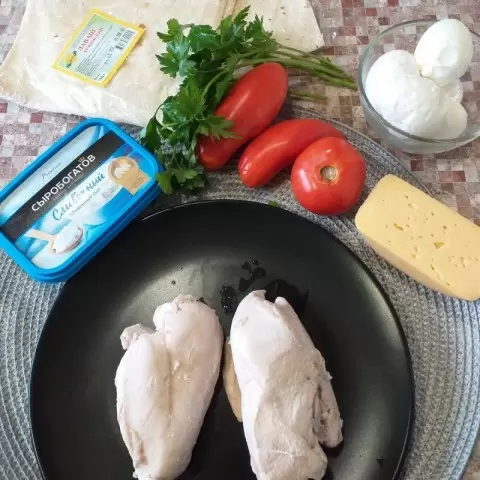 Начнём с отваривания куриного филе до готовности, не забыв сохранить бульон для других блюд. После этого нарезаем курицу и яйца кубиками, а помидоры — дольками. Твёрдый сыр натираем на мелкой тёрке и нарезаем зелень.