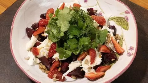 Приготовление этого потрясающего салата займет всего несколько минут. Сначала очистить запеченную свёклу и нарезать на небольшие кусочки. Клубнику следует поделить на четыре части и добавить в одну миску вместе с нарезанной моцареллой и семенами подсолнечника. В отдельной пиале смешать растительное масло, соль, перец и сок лимона. Полученной заправкой полить салат, перед подачей украсив его свежей зеленью, лучше всего листиками базилика.