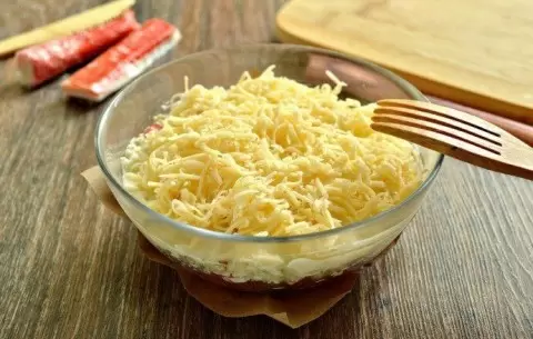 Крабовые палочки нарезаются тонкими кольцами, после чего следует повторить процесс с майонезом, добавив его на второй слой.