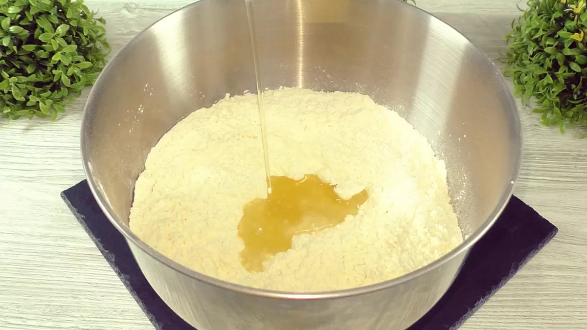 Начать стоит с приготовления теста. В теплую воду добавить соль, тщательно перемешать до полного растворения. В миске просеять муку, добавить растительное масло и слегка перемешать. Постепенно вливать горячую воду, перемешивая тесто. Как только удобнее станет замешивать вручную, следует перейти к этому этапу. При замешивании теста важно достичь однородной и гладкой консистенции. После этого тесто накрыть пленкой и оставить отдыхать на 30 минут, лучше разделить на две части для удобства.