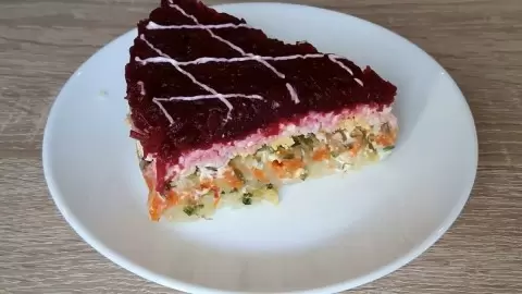 В результате получился слоёный салат, напоминающий знаменитую «шубу». Овощи могут стать настоящей находкой и даже украсить праздничный стол, ведь приготовленный высококлассно, он выглядит очень аппетитно.