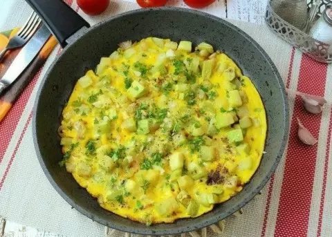 Огурцы нарезать и оставить помариноваться с солью. Лук и чеснок обжарить, затем добавить огурцы и готовить до прозрачности. В конце влить яйца и обжарить до готовности. Посыпать зеленью перед подачей.