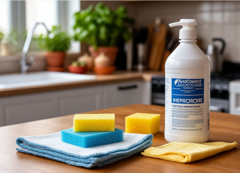 - Дезинфекция столешниц и других поверхностей: Смешайте одну часть 3% перекиси с одной частью воды и налейте в пульверизатор. Распылите раствор на кухонные столы и разделочные доски. Оставьте на 5-10 минут, затем просто протрите чистой тряпкой.