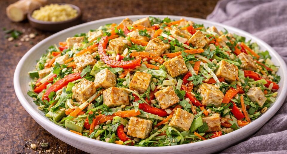 Салат с тофу и авокадо — отличный выбор для тех, кто стремится питаться правильно. Тофу обеспечивает необходимый белок, авокадо добавляет полезные жиры, а свежие овощи дарят хрустящую текстуру, витамины и помогают избежать переедания.