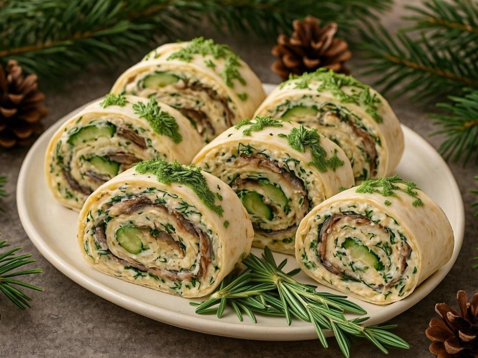Закуска готова, ее можно украсить свежим укропом или листьями салата. Сочетание сырной начинки с хрустящими огурцами и ароматными шпротами делает этот рулет отличным выбором для любого праздничного стола.