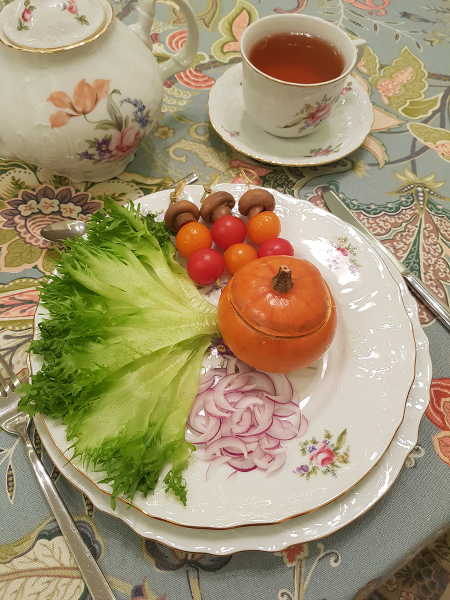 Фаршированные тыквы после запекания раскладываются по тарелкам и могут быть дополнены листьями салата, свежими помидорами черри и маринованными шампиньонами с сладким красным луком. Это не только вкусное, но и изумительно красивое блюдо станет прекрасным угощением для осеннего ужина или праздничного застолья!