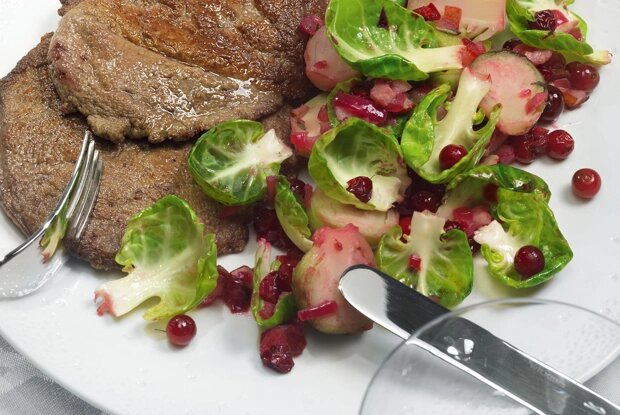 1. Подготовка гарнира: Бекон нарезается мелкими кубиками и обжаривается на сковороде до румяности. После этого добавляют нарезанный лук, приправляют солью и перцем, как следует тушат до мягкости. Затем в сковороду добавляется шалфей, немного сахара, клюква и брюссельская капуста. Все это тушится не более двух минут, чтобы сохранить свежесть овощей.