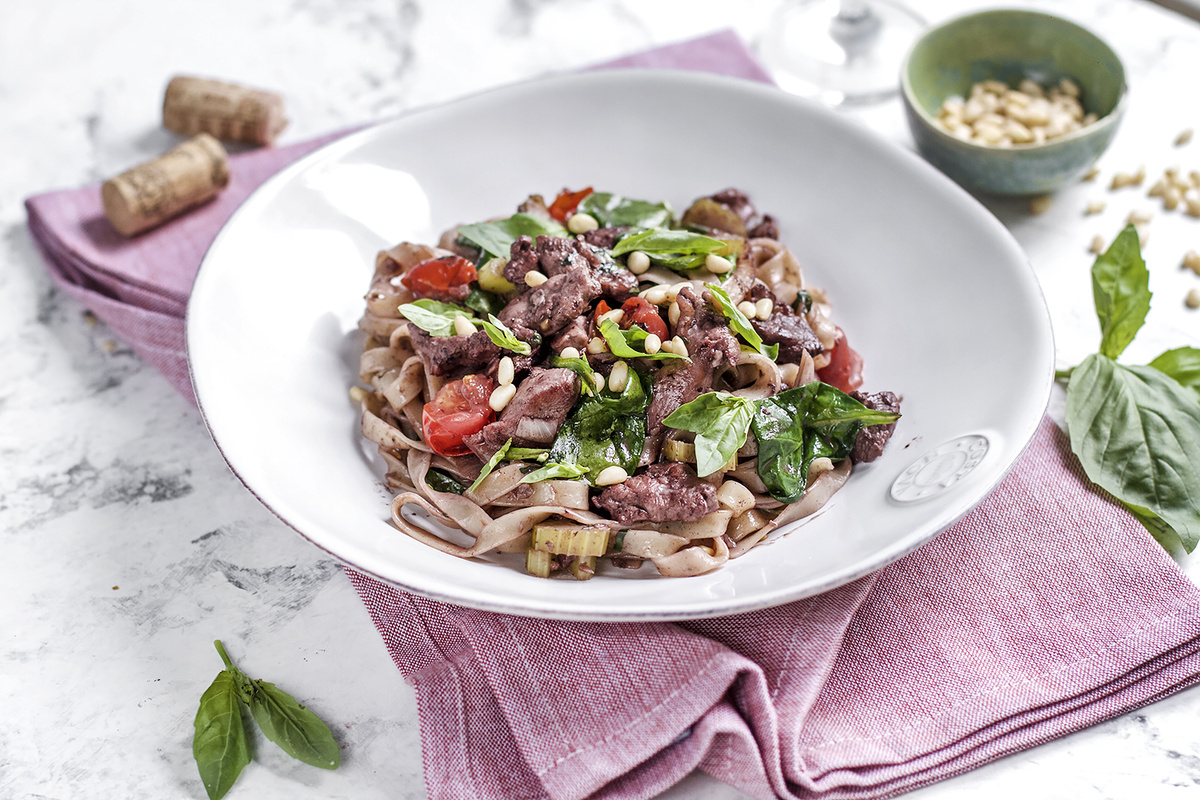 Шаг 2: К утке добавьте нарезанные кубиками помидоры и кусочки сельдерея, приправьте солью и перцем. Жарьте еще 1-2 минуты. Влейте красное вино и дайте ему выпариться 30 секунд. Добавьте половник воды из-под пасты и прогрейте смесь 1-2 минуты. Добавьте протертую тальятелле на сковороду и тщательно перемешайте. Перед самой подачей посыпьте кедровыми орехами и украсьте свежими листиками базилика. Блюдо готово к degustazione!