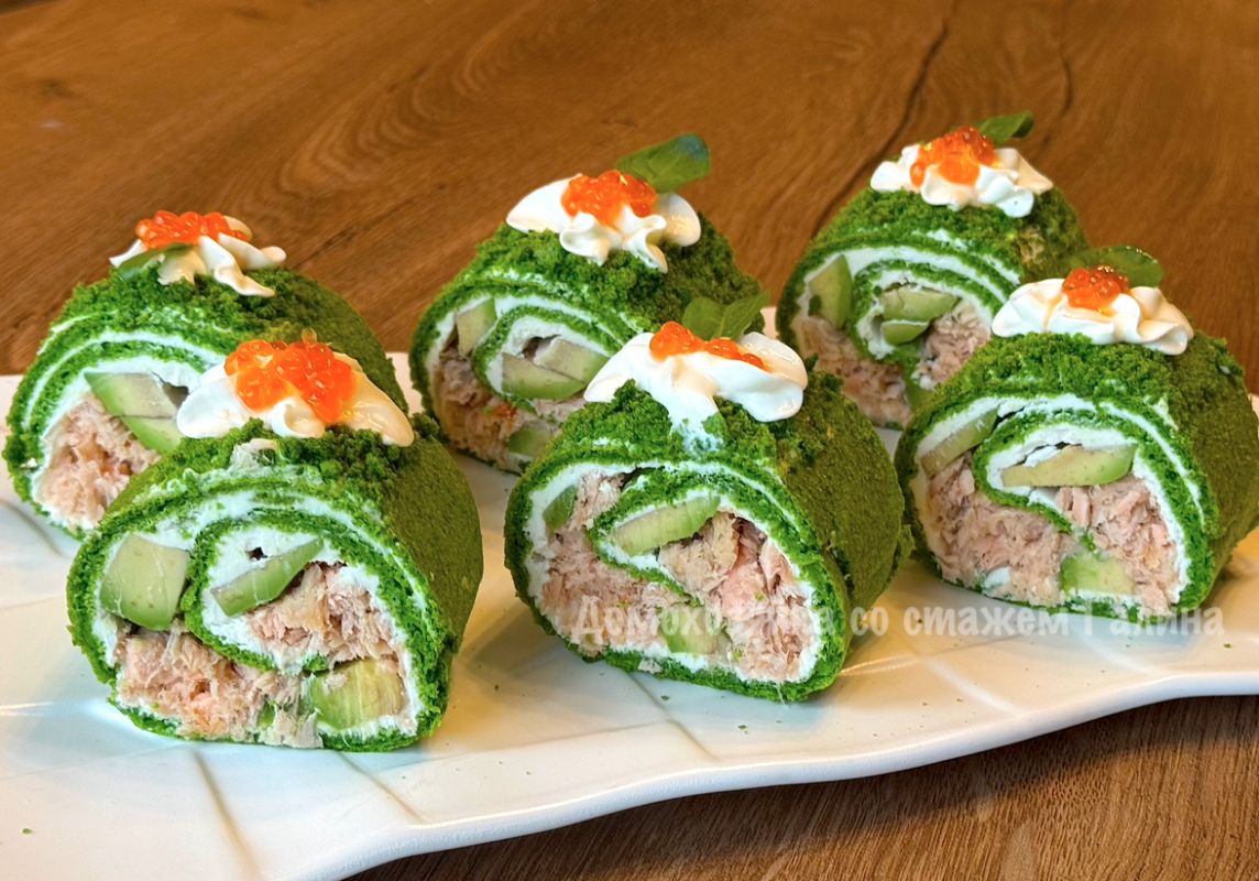 Перед подачей рулет смажьте сыром, обсыпьте крошкой из обрезков коржа и украсьте по собственному усмотрению, добавив, например, икру для праздничного оформления. Далее нарезать на порции и подавать к столу! Этот рулет станет настоящим вкусным акцентом на любом праздничном столе, пишет Домохозяйка со стажем Галина.