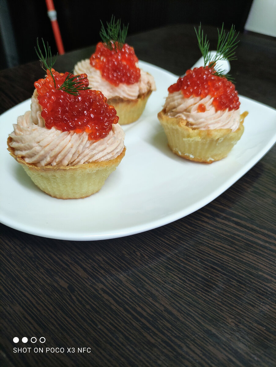 Чтобы создать нежный крем, филе форели следует пробить блендером до состояния пюре. Затем добавить сливочный сыр и снова взбить до получения однородной массы. Готовый крем поместить в кондитерский мешок с насадкой и наполнить тарталетки, или же можно использовать ложку для размещения крема в тарталетках. Настоящей вишенкой на торте станет украшение красной икрой.