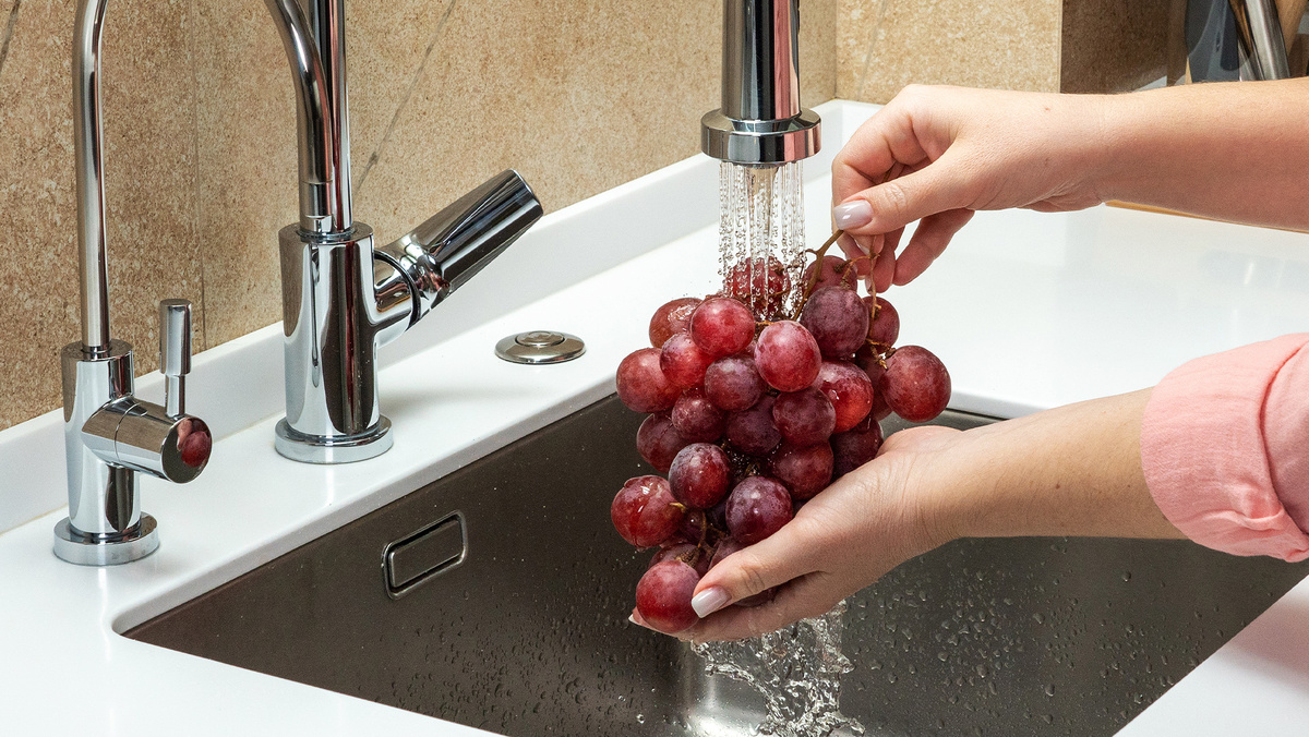 - Виноград: Этот плод можно очистить, просто промыв его под струёй воды. Снимать ягоды с веточек не обязательно — достаточно тщательно обработать гроздь со всех сторон.