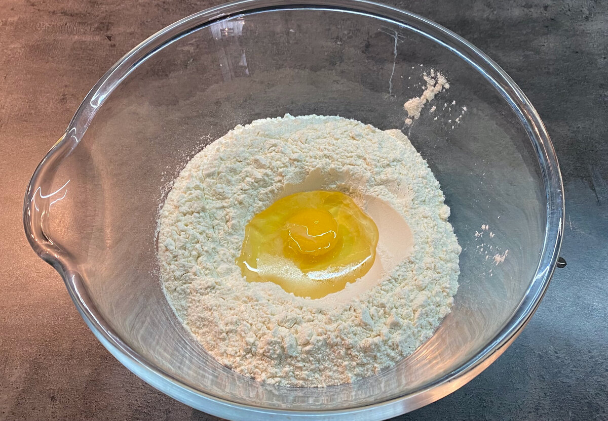 1. В большой миске смешайте муку и соль. В центре сделайте углубление, куда нужно вбить яйцо и влить растительное масло. Легко перемешайте, чтобы компоненты объединились.