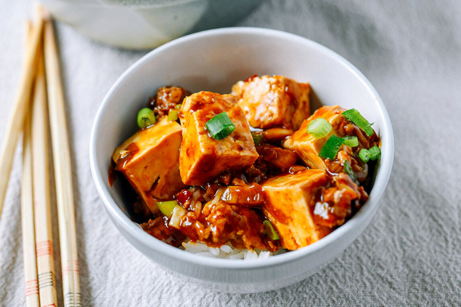 Начать стоит с нарезки зеленого лука и измельчения чеснока. Репчатый лук нарезать тонкими полукольцами.Тофу следует нарезать кубиками, примерно 2 см в толщину.В сковороде разогреть растительное масло. Добавить измельченный чеснок и обжаривать в течение 30 секунд до появления аромата.Затем добавить свиной фарш и жарить до румяной корочки, около 1–2 минут. Повысить температуру и добавить репчатый лук, обжаривать еще 1–2 минуты до полупрозрачного состояния.Добавить шаосинское вино, соус хойсин и пасту доубаньцзян, тщательно перемешать и готовить еще 30 секунд.Влить куриный бульон, добавить перец и сахар, а также кунжутное масло. Довести до кипения.Смешать кукурузный крахмал с водой, добавить в соус и кипятить 30 секунд до загустения.Вложить кубики тофу в соус и аккуратно перемешать, дать покипеть 2 минуты.Снять с огня и подавать, посыпав зеленым луком.Приятного аппетита!