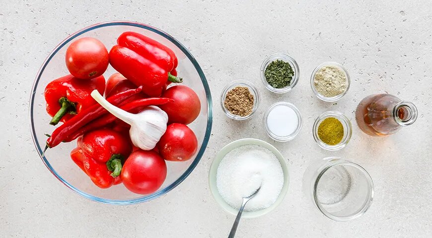 Заготовить аджику на зиму без варки — это просто, быстро и вкусно. В этом рецепте необходимо использовать только свежие продукты: спелые помидоры, сладкий и острый перцы, чеснок, различные сухие травы, а также соль, сахар и уксус. Для этого понадобятся также стерилизованные полулитровые банки с крышками и мясорубка с средней решеткой.