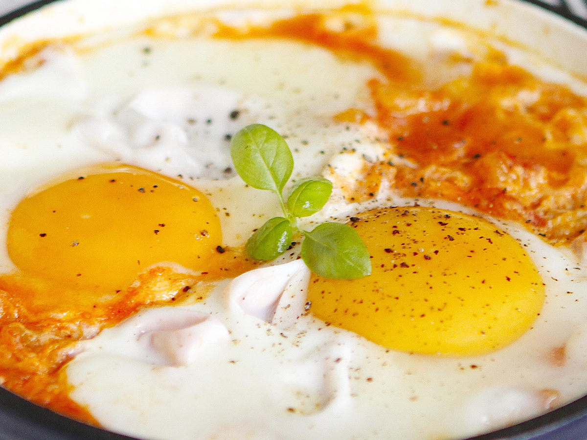 Как только помидоры набирают аромат, при помощи лопатки создайте две небольшие лунки в овощной смеси и аккуратно вбейте яйца. Для изящного эффекта старайтесь оставить желтки целыми. Накройте сковородку крышкой и уменьшите огонь: пусть все ингредиенты потихоньку схватываются и объединяются.