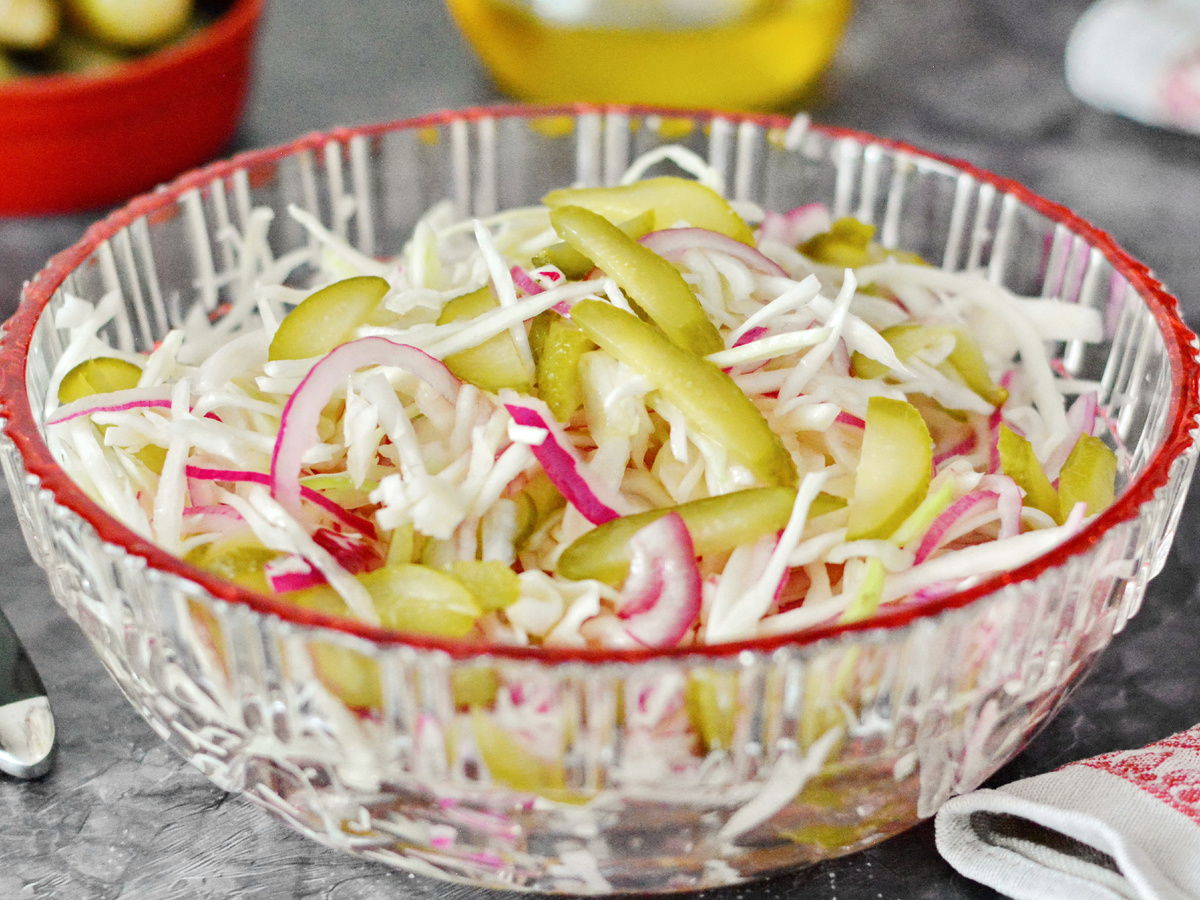 Смешайте капусту и лук в глубокой миске, добавив сахар и тщательно перетирая смесь руками. Это делает салат более сочным, так как капуста выделит сок. Затем добавьте нарезанные огурцы и полейте подсолнечным маслом. Перемешайте и попробуйте — вероятно, дополнительная соль не потребуется благодаря солёным огурцам.