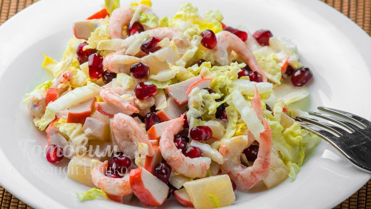 4. Сборка салата: В глубокой миске смешать нарезанную капусту, крабовые палочки, ананасы, очищенные креветки и зерна граната. Тщательно перемешать все ингредиенты.