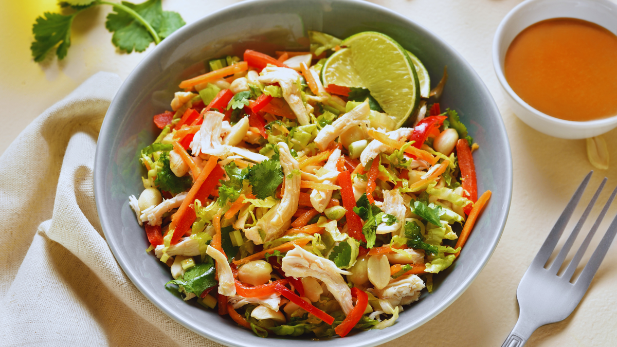 Насладитесь ярким и свежим вкусом китайского куриного салата. Этот изысканный азиатский рецепт сочетает хрустящую капусту, нежную куриную грудку на гриле и сладкий перец, в обрамлении насыщенной арахисово-кунжутной заправки.