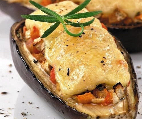 Выбрав крупные баклажаны, разрезать их вдоль и выдолбить мякоть, оставив стенки толщиной около 0,5 см.Замочить баклажаны в холодной подсоленной воде на 30–60 минут, периодически меняя воду, чтобы избавиться от горечи.Лук и чеснок нарезать мелкими кубиками.Куриное филе, мякоть баклажана и помидоры нарезать кубиками по 1,5–2 см, а сыр натереть на крупной терке.Обжарить лук и чеснок до золотистого цвета, затем добавить куриное филе и обжаривать на сильном огне несколько минут.Добавить мякоть баклажанов и продолжать жарить еще 10 минут, приправив солью и перцем.В конце добавления жареных ингредиентов влить помидоры, зелень и нарезанный перец чили.Положите баклажанные лодочки на смазанный маслом противень, нафаршируйте полученной смесью и намазать сверху майонезом.Запекать в духовке при температуре 180 градусов в течение 30–35 минут. За 10 минут до окончанию приготовления посыпьте баклажаны натертым сыром.