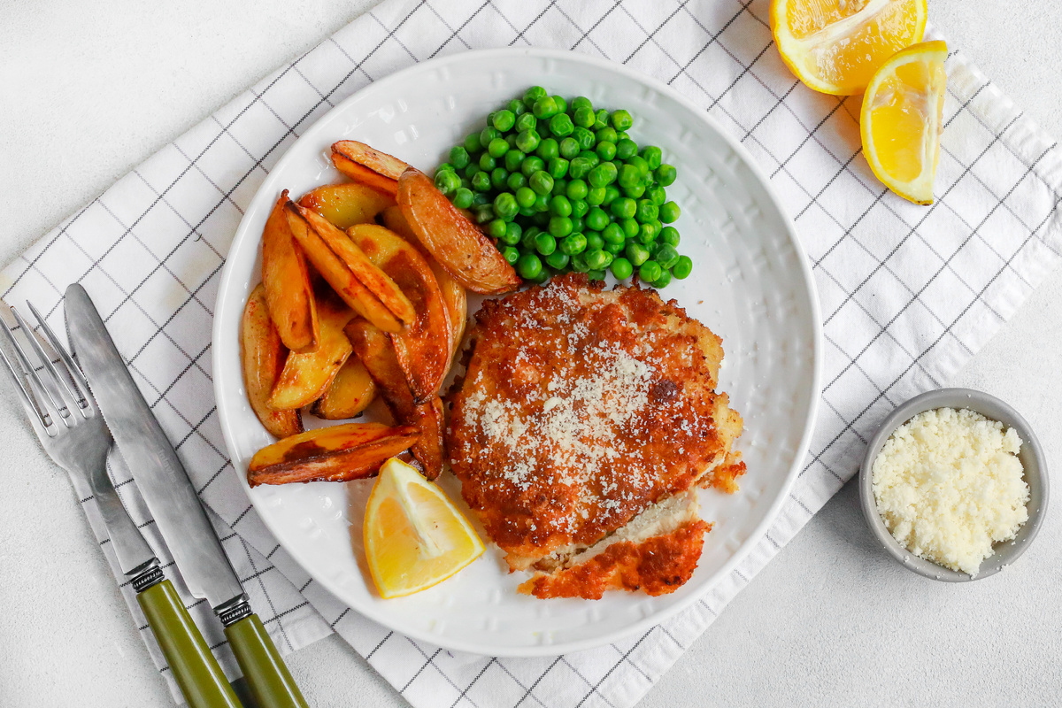 Шаг 3: Готовые шницели переложить на противень к картофелю и посыпать тертым пармезаном. Запекать еще 7-10 минут. Не пересушите мясо! В это время закипятите 300 мл воды и залейте горошек на 1-2 минуты, после чего слейте воду.