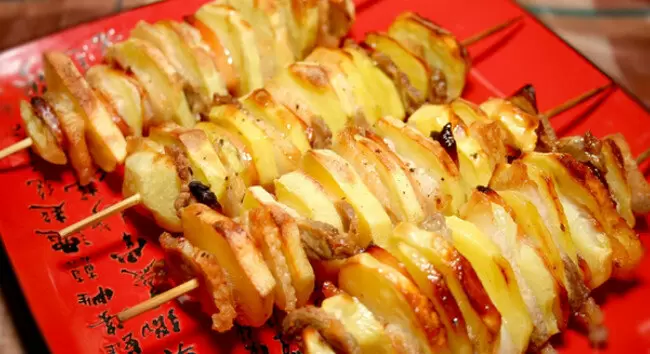 6. На деревянные шпажки нанизывают картофельные кружки, чередуя их с кусочками сала и бекона.