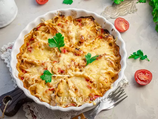 - Закуска из лаваша с курицей и сыром. Понадобится лаваш, куриное филе, лук, чеснок и сливки. Это простое, но сытное блюдо готовится всего за 25 минут (151 кКал).