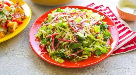 Этот легкий и сытный салат можно создать за считанные минуты. В нем соединились свежие листья зеленого салата, консервированный нут и ваш любимый тип мясной составляющей, будь то салями, колбаса или остатки запеченного мяса. Такой салат станет отличной заменой полноценного обеда.