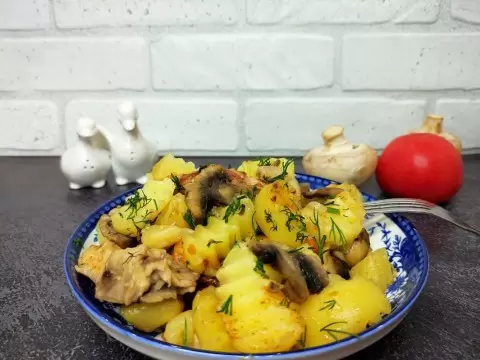 Это блюдо не только вкусное, но и лёгкое в приготовлении. Нежная курица в сочетании с ароматными грибами и картошкой создаёт гармоничный ансамбль, который никого не оставит равнодушным.