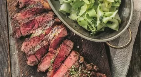 Топ-блейд, известный своим великолепным вкусом и сочностью, представляет собой великолепную говяжью вырезку, прекрасно подходящую для жарки. Этот мясной деликатес в сочетании с легкой и аппетитной пастой из кабачков делает блюдо идеальным для тех, кто стремится к сбалансированному питанию.