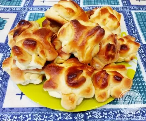 10. Когда тесто поднимется, разделить его на небольшие кусочки, раскатать, намазать кремом и сложить пополам, придавая форму, напоминающую цветок.