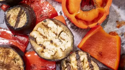 Когда сковорода хорошо разогреется, уложите кусочки перца кожицей вниз. Обжарьте их до появления аромата, а затем подожгите верх для придания гастрономического оттенка. Обжаривайте и баклажаны, пока на них не появятся характерные полоски, после чего также перенесите их на противень, покрытый пергаментом.