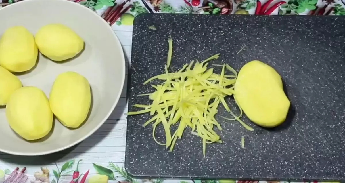 Картофель тщательно моется, очищается и нарезается тонкой соломкой. После этого его следует промыть в холодной воде и отжать в дуршлаге.
