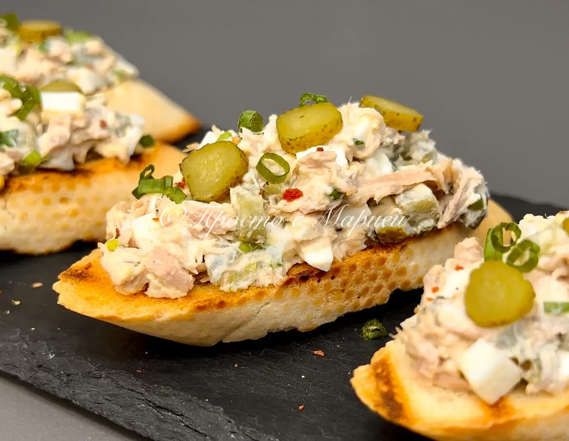 Теперь возвращаемся к нашим бутербродам: смешиваем все подготовленные ингредиенты в салатнике, добавляем черный молотый перец, сметану и зернистую горчицу. Тщательно перемешиваем, а затем укладываем начинку на подсушенные кусочки багета. Для декора подойдут кружочки огурцов и зелёный лук.