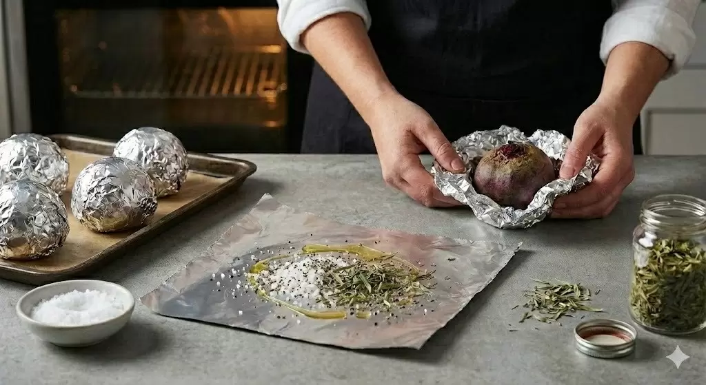 Необходимо не просто завернуть корнеплоды в фольгу, а создать внутри своего рода «ароматную баню», добавляя специи.