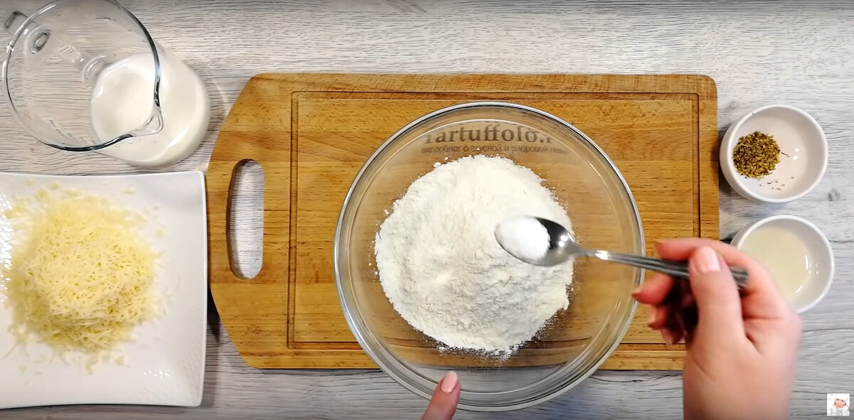 В глубокой миске соедините муку и соль, хорошо перемешайте. После этого добавьте орегано и натертый сыр, снова тщательно перемешайте. Влейте растительное масло и начните замешивать тесто.