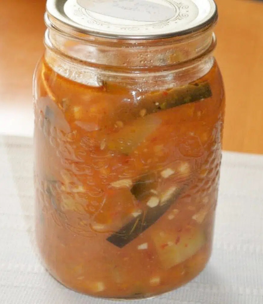 Совсем не зря эта популярная овощная закуска получила такое необычное название. Длинные тонкие ломтики кабачков в сочетании с пряными ингредиентами делают блюдо особенно острым, что добавляет элемент шутливости к старым анекдотам о тещах.