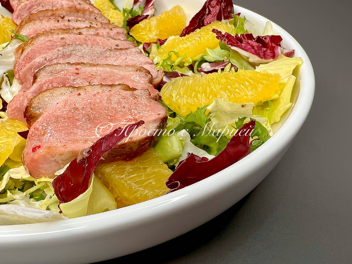 Салат собирается в красивом неглубоком салатнике – в основании укладывается свежий салатный микс, сверху размещаются апельсиновые дольки и нарезанная утка, которая поливается приготовленной заправкой. Примечание: такой вкусный салат едва ли захочется делить с другими, так что стоит запланировать его только для себя.