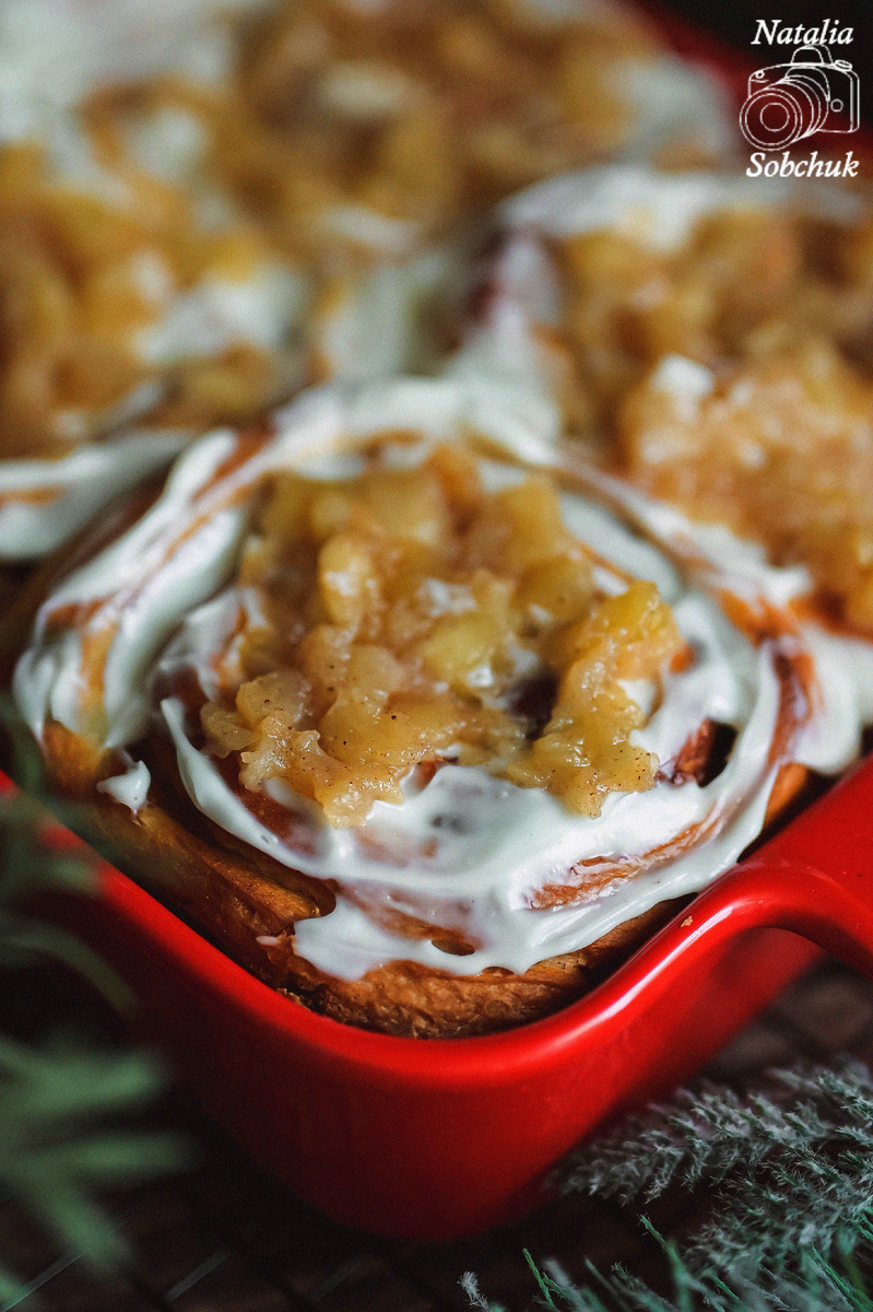 Выпекать синнабоны нужно в разогретой до 180 градусов духовке около 25-30 минут. После охлаждения булочки обильно покрыть кремом, и, при желании, украсить тушёными яблоками.