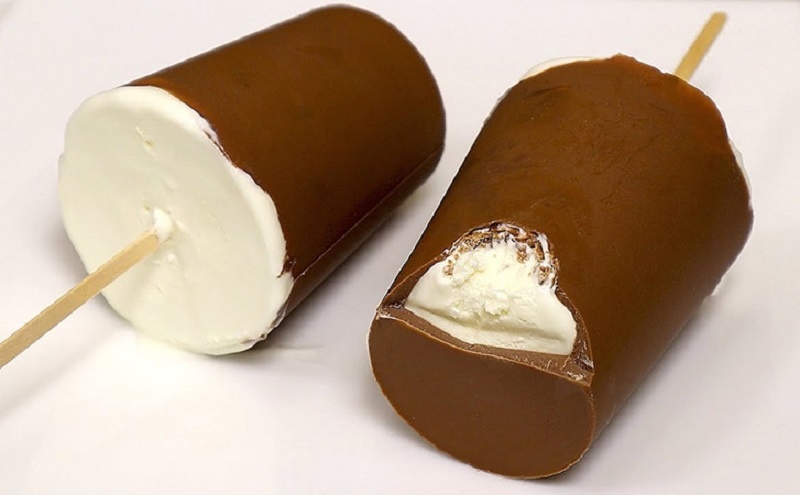 Готовится всё без спешки: шоколад плавится, образуя хрустящую оболочку, затем взбиваются сливки с сгущёнкой до густой гладкой массы. Оболочка застыла, внутрь вливается сливочная смесь, проходит окукливание в морозильнике и через пару часов десерт готов к наслаждению.